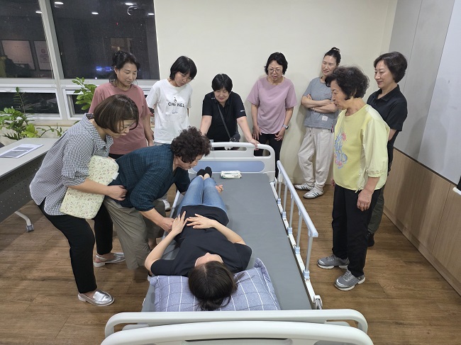 실제 돌봄 상황을 가정한 실습을 통해 장기요양요원이 다치지 않도록 돕는 이동 보조법을 배워보는 시간을 가졌습니다.